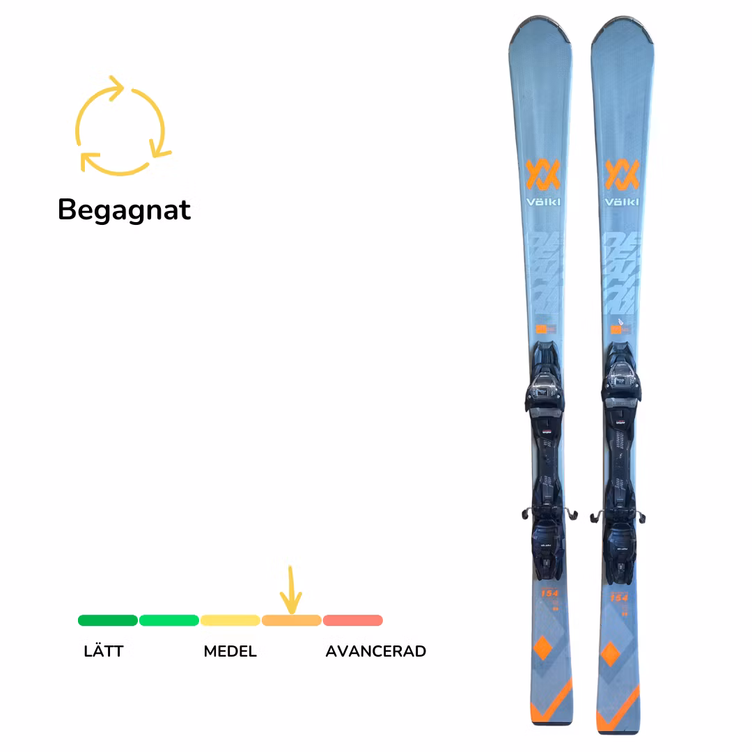 Begagnade Völkl DEACON 75Skidorna är slipade och vallade. Slitage och skav förekommer. Skidan har en justerbar bindning, där både tå- och häldelen enkelt kan an