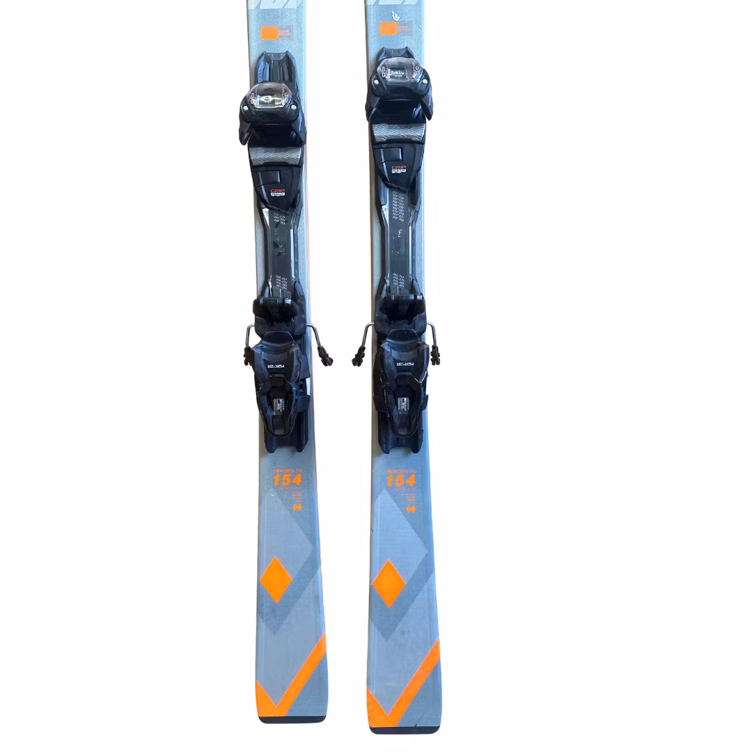 Skidorna är slipade och vallade. Slitage och skav förekommer. Skidan har en justerbar bindning, där både tå- och häldelen enkelt kan anpassas efter olika pjäxstorlekar. Perfekt för växande fötter eller om fler i familjen vill använda samma skidor.