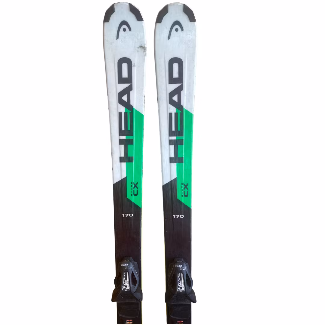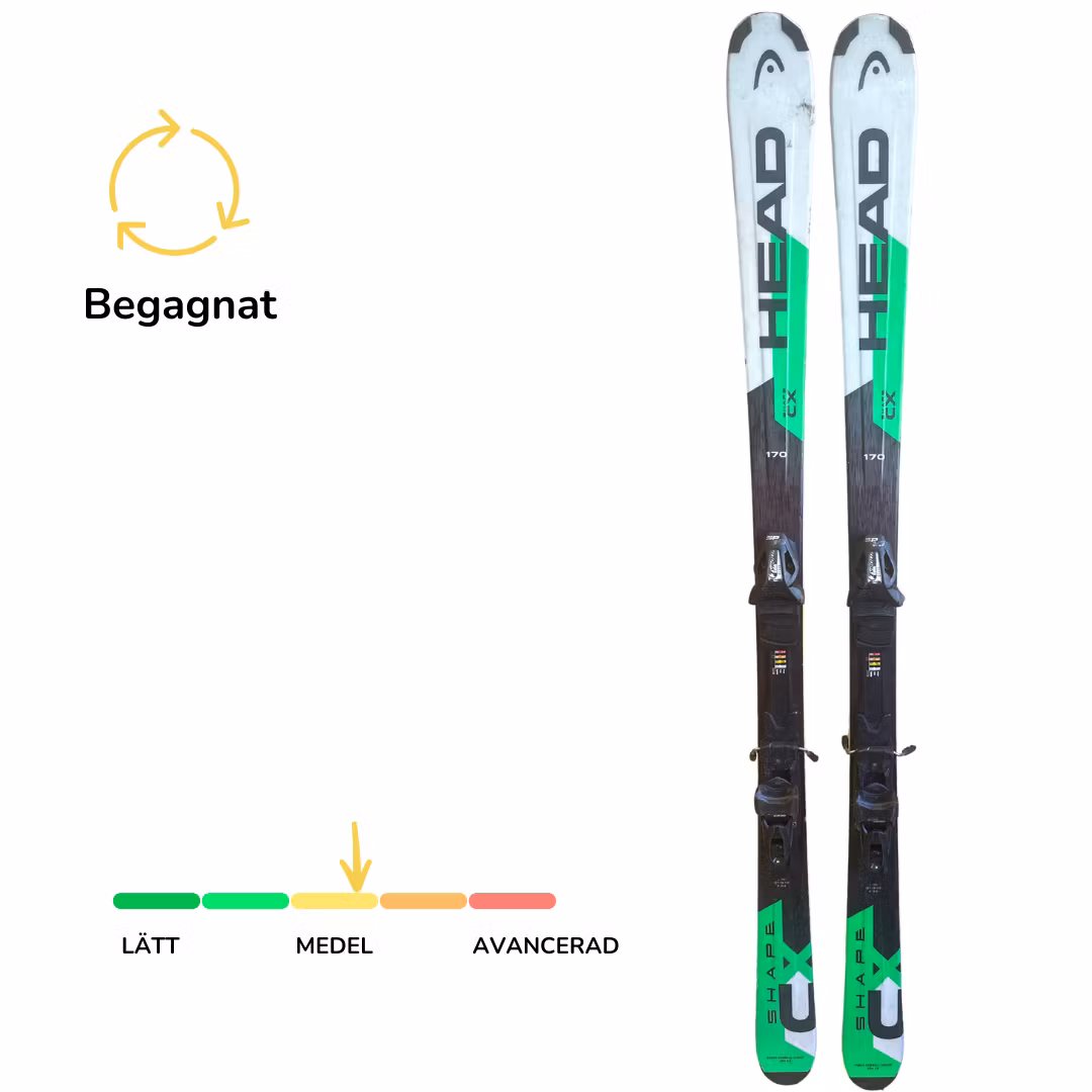 Begagnad Head Shape CX Skidorna är slipade och vallade. Slitage och skav förekommer. Skidorna har en binding som går att justera efter alla seniorstorlekar.