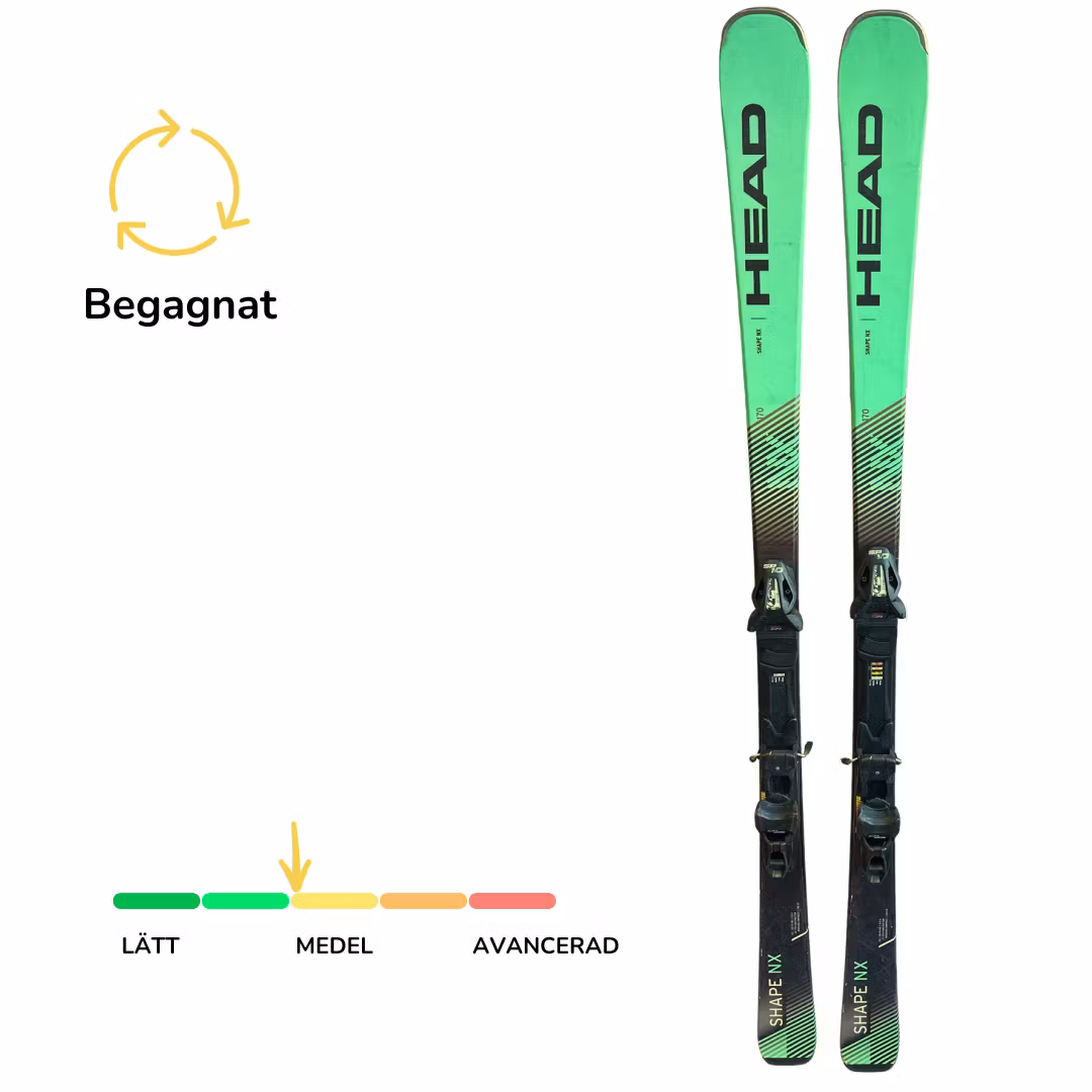 Begagnad Head Shape NX. Skidorna är slipade och vallade. Slitage och skav förekommer.Skidan kommer med en justerbar demo-bindning, där både tå- och häldele