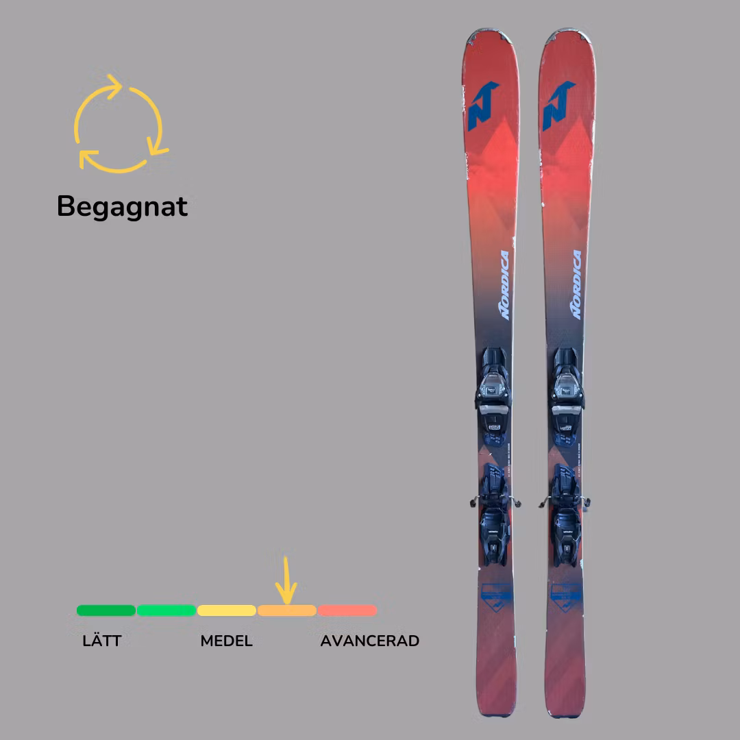 Begagnad Nordica Navigator 85. Skidorna är slipade och vallade. Slitage och skav förekommer. Skidorna har en binding som går att justera efter alla seniorstorlekar. Bindningen är GripWalk kompatibel