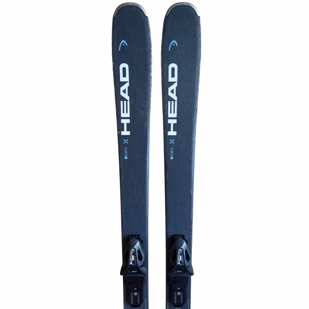 Begagnade Head Kore X85.  Skidorna är slipade och vallade. Slitage och skav förekommer. Skidan har en justerbar bindning, där både tå- och häldelen enkelt