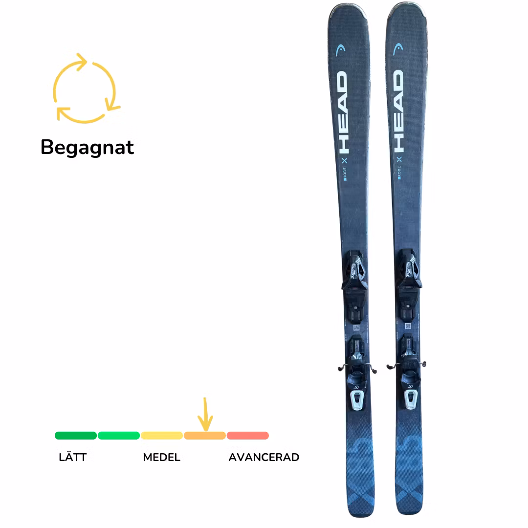 Begagnade Head Kore X85.  Skidorna är slipade och vallade. Slitage och skav förekommer. Skidorna har en binding som går att justera efter alla seniorstorlekar. Bindingen är GripWalk kompatibel