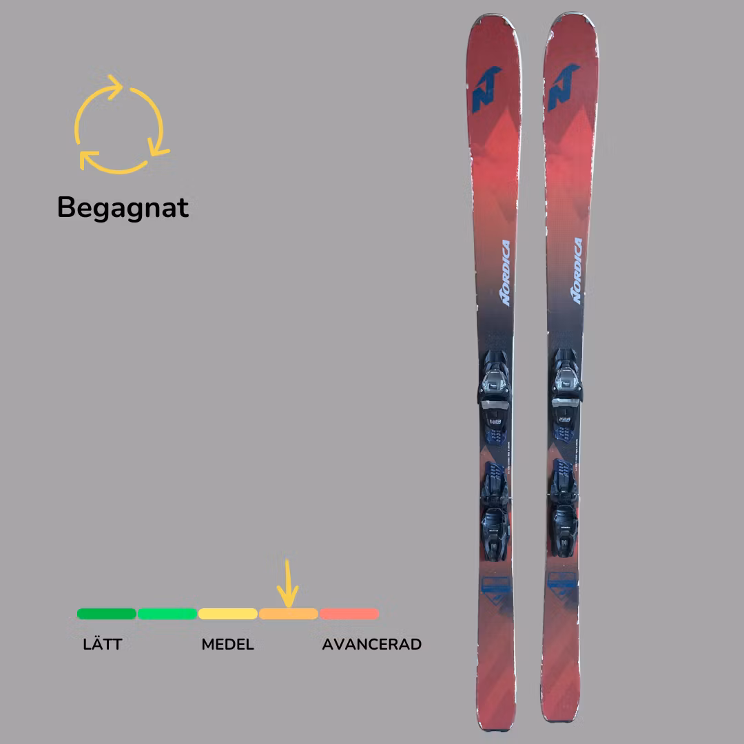 Begagnad Nordica Navigator 85. Skidorna är slipade och vallade. Slitage och skav förekommer. Skidorna har en binding som går att justera efter alla seniorstorlekar. Bindningen är GripWalk kompatibel