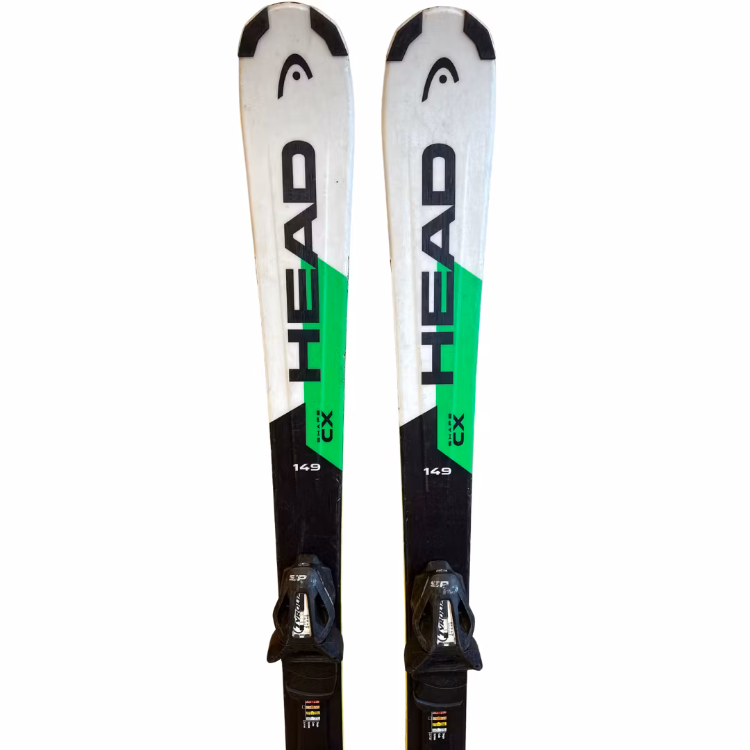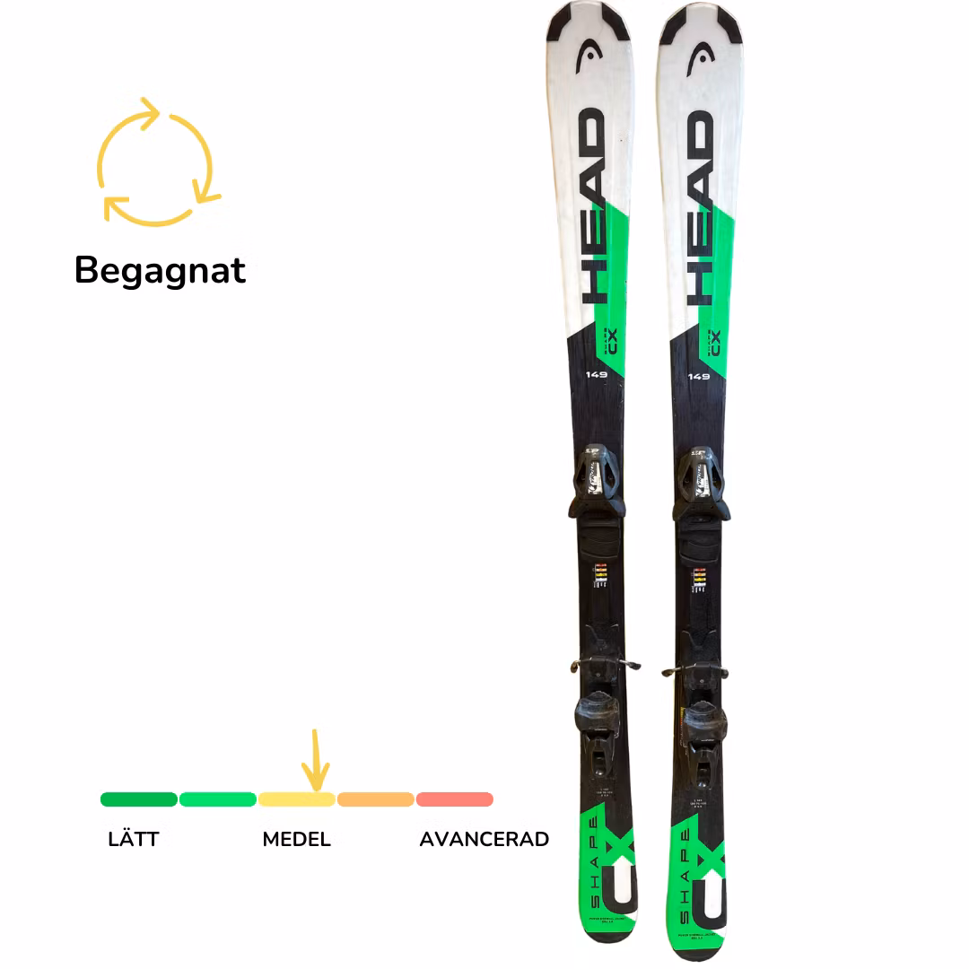 Begagnad Head Shape CX Skidorna är slipade och vallade. Slitage och skav förekommer. Skidorna har en binding som går att justera efter alla seniorstorlekar.