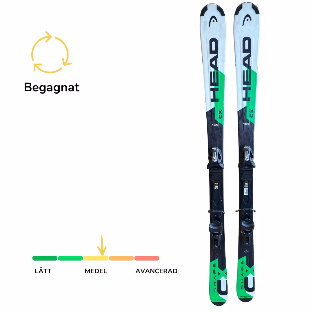 Begagnad Head Shape CX Skidorna är slipade och vallade. Slitage och skav förekommer. Skidorna har en binding som går att justera efter alla seniorstorlekar.