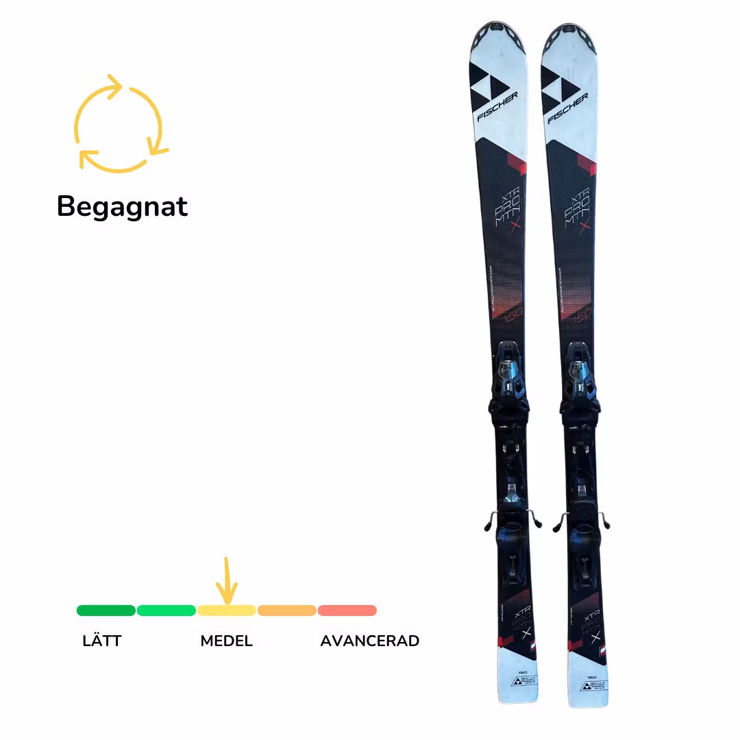 Begagnade Fischer XTR Pro MTN X Skidorna är slipade och vallade. Slitage och skav förekommer.Skidorna har en binding som går att justera efter alla seniors